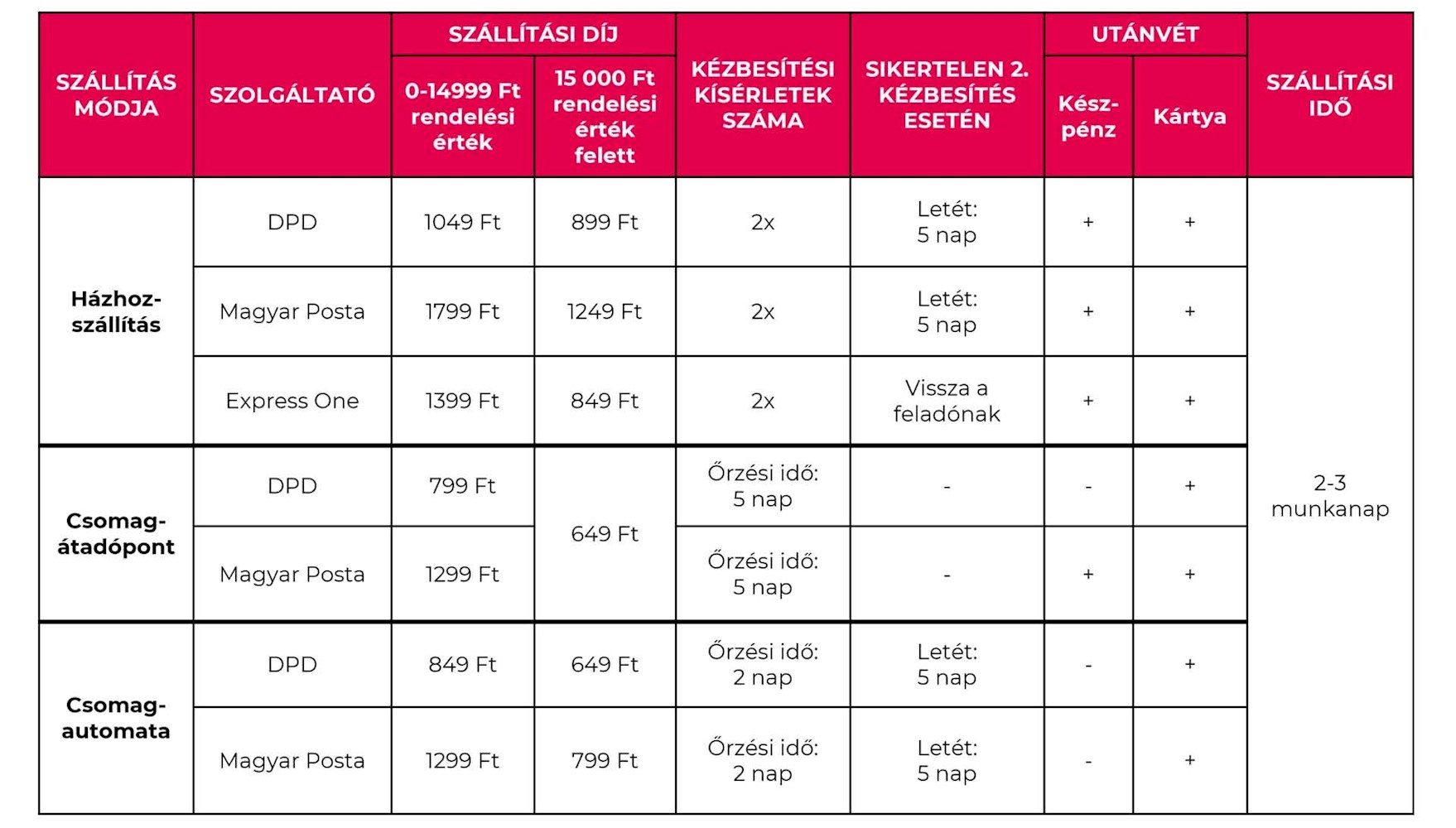 Több szállítási mód közül választhatsz, amelyik a számodra a legkényelmesebb. Minden esetben a terméket 2-3 munkanap alatt kiszállítjuk. A részletekért kattints IDE